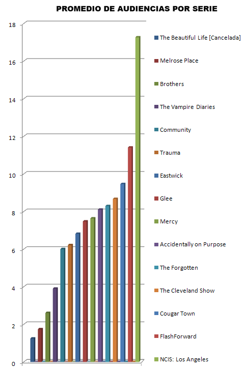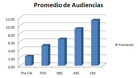 Este mes traemos algunas estadísticas sobre algunas series de estreno de esta temporada en diferentes cadenas, incluyendo datos comparativos entre The CW, Fox, NBC, ABC y CBS. A continuación podéis ver una gráfica en la que se representa de menos a mayor audiencia una extensa lista de series y otra con los promedios entre cadenas: