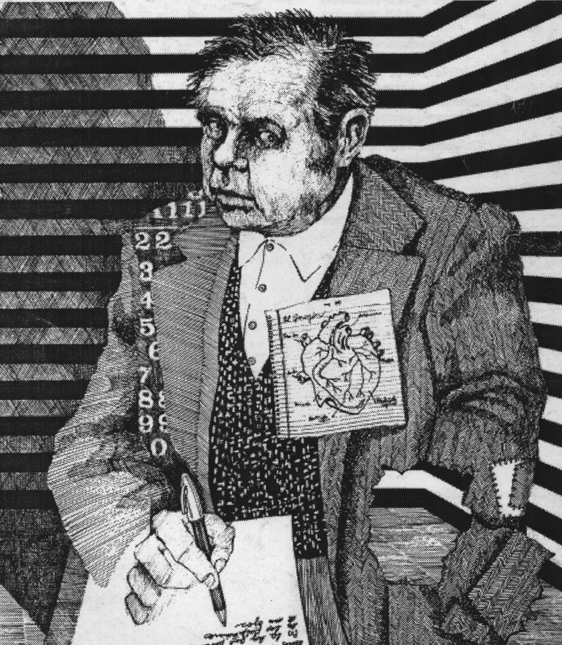 En el próximo dibujo, también realizado en tinta, muestra un señor con una hoja con el dibujo de un corazón en el pecho. Su título, casi una reseña de lo que desea expresar: “Riesgo de infarto de miocardio, debido a la prolongada contemplación de la lluvia”. Gustavo, hace de sus trabajos un mundo de imágenes con una personalidad intensa y muy definida .