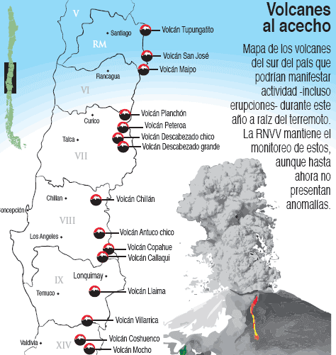 Según los científicos, esto no ha hecho más que empezar. Las placas tectónicas de Nazca fueron exprimidas hacia abajo, “subducción”, por debajo de la placa de América del sur. Haciendo mucha presión y a partir de toda la actividad que se está generando en su interior por esa fricción, hay un alto riesgo de “una serie de erupciones volcánicas” a lo largo de la falla que corre debajo de los Andes Centrales y Sur. Otra de las noticias que nos dejaron con mucha inquietud, es que el eje de la tierra fue alterado debido a la fuerza de energía que se liberó en el terremoto del 27 de febrero. Esto podría desencadenar otras consecuencias.