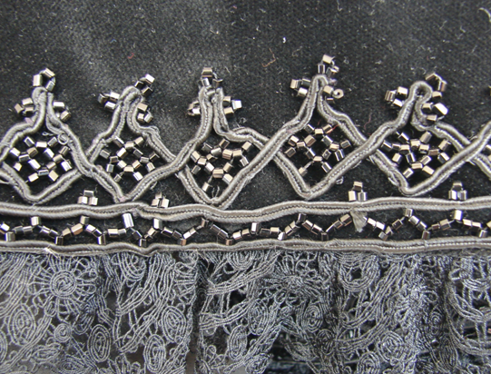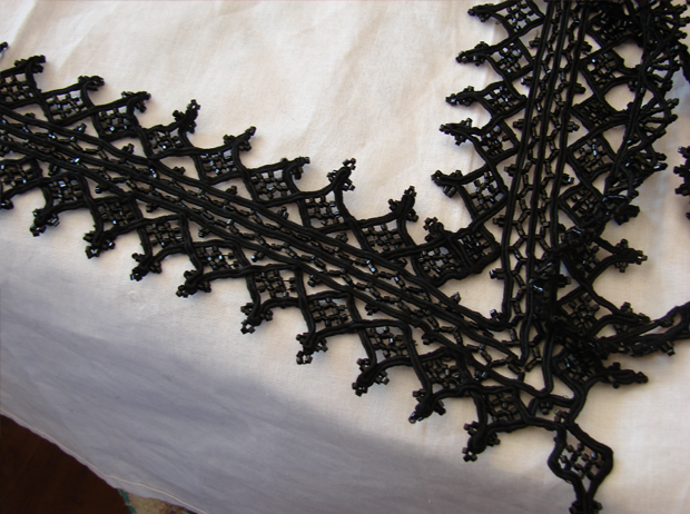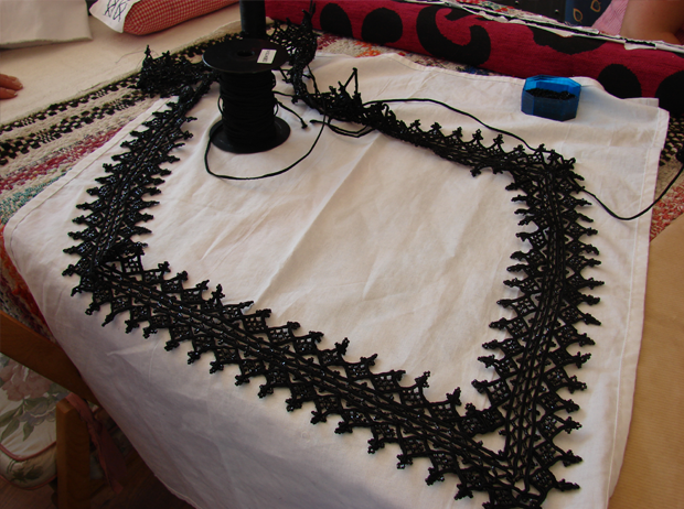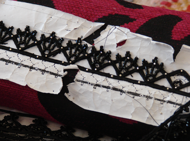 Un trabajo minucioso y muy delicado de “Bordado al aire”, que con abalorios y cordón negro van “bordando” sobre un almohadón en el que previamente se ha ajustado pinchando con alfileres un patrón o dibujo del diseño a realizar.