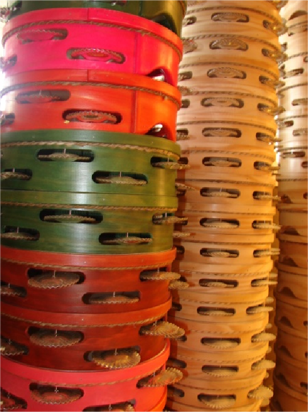 *Un ejemplo de las panderetas de colores. Tarrañolas, pitos, que son un tipo de castañuelas pequeñas que usan los hombres en los bailes tradicionales y castañuelas.