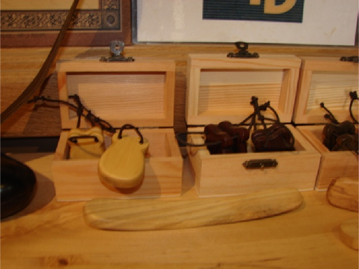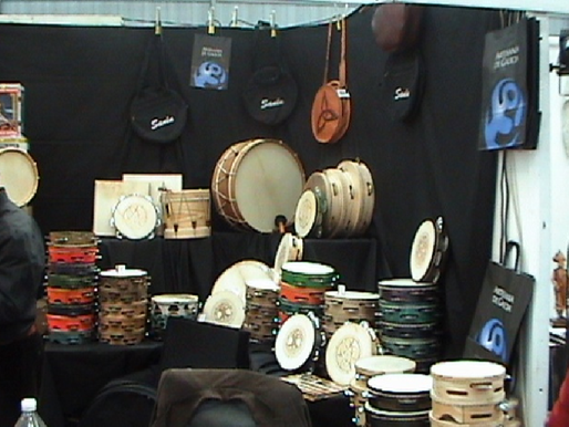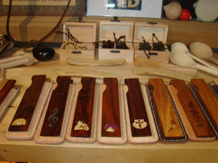 *Pitos en sus cajitas de madera. Exposición de varios modelos de panderetas, en la Feria Artesanal de Melide, A Coruña.