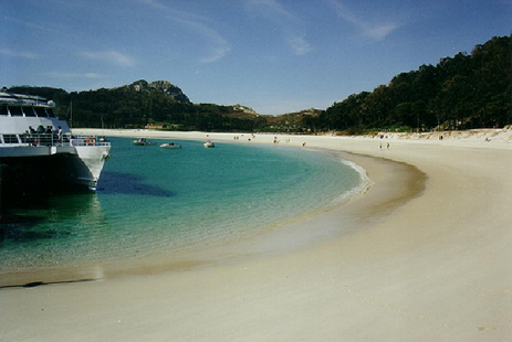 *Las Islas Cíes, un paraíso natural para descubrir. Sus playas son consideradas de las más bellas de Europa, como la que se ve a la derecha Rodas. Junto con las Islas de Ons conforman el Parque Natural de las Islas Atlánticas de Galicia.
