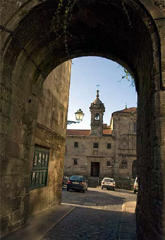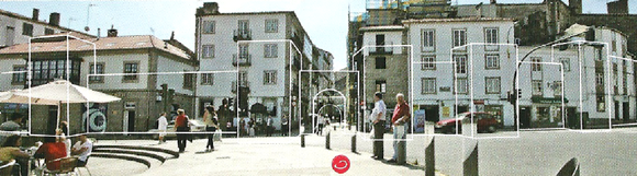 *Fotografía de la actual “Porta do Camiño”, con el trazado de la original entrada en la muralla. Esta sección se demolió entre 1800 y 1835.