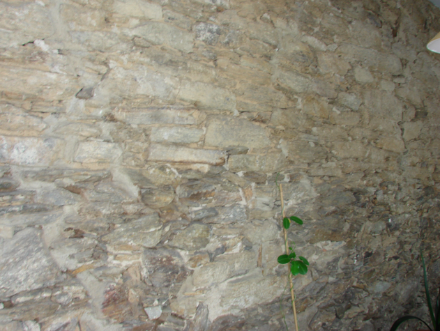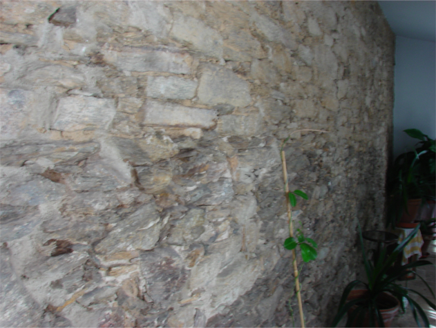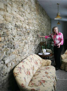 *Consuelo en la sala, junto al gran trozo de la muralla que sirve de medianera.