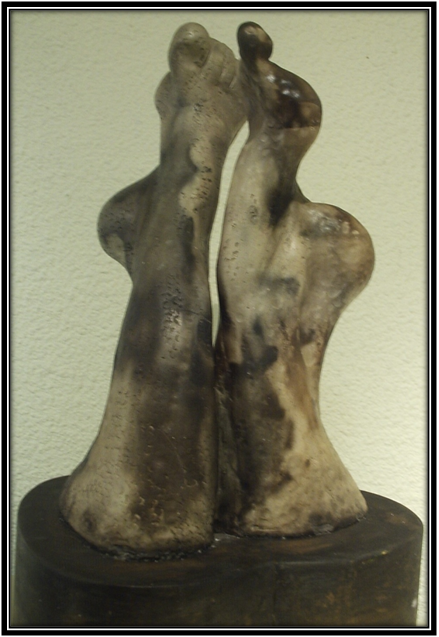 Tratar de expresar este sentimiento fue todo un desafío, encontrar la manera fue lo mejor, el material y la técnica me dieron la magia que buscaba. Huelga decir, que solo en la INTIMIDAD dos seres se encuentran, los pies están desnudos y los dedos de frente buscando el eterno contacto.