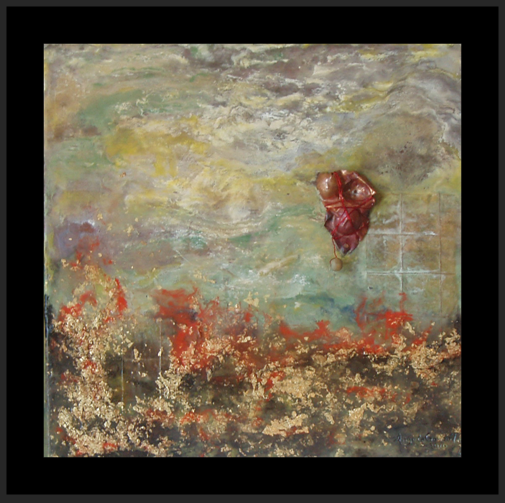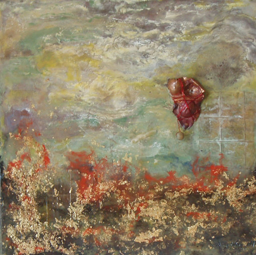—El cuadro Revelación y paz (2010),que viene a continuación ha sido trabajado con cera de abeja, pigmentos, metal, hilo y papel sobre madera.
