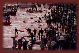 Con la llegada de la primavera, los habitantes de Feroe se preparan para algo que llevan esperando meses. Mediante diversos procedimientos con barcas, y dejando caer piedras al agua, instan a unos cuantos grupos de calderones a desplazarse rumbo a la costa, donde los espera la gente. Esta fase puede durar horas, por lo que la gente espera impaciente a que llegue el momento. Es entonces cuando las desafortunadas ballenas piloto son sorprendidas. El mar se tiñe de rojo y las playas se llenan de los cadáveres de estos animales, los cuales pasan a formar parte de las toneladas de carne que irán a parar a las despensas de los habitantes.