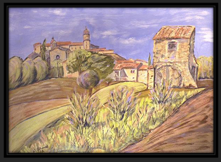 Wally, junto con su esposo Fred, han recorrido mucho mundo plasmando su arte. En el caso del Batik, se inspiró en la gente de un pueblo de México. El siguiente es un paisaje, realizado con técnica gouache. Nos ubica en la aldea Sigonce, en Pays de Forcalquier. Un encantador pueblo, con ese toque tan provenzal.