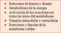 Además de intervenir en la formación y estructura de los huesos, el P está envuelto en muchas funciones fisiológicas (ver Tabla), como lo evidencia la presencia de P en los iones fosfato y en diferentes compuestos orgánicos intracelulares y extracelulares o a nivel de la membrana celular.