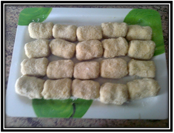 Cuando están todas enharinadas, se pasan por huevo batido y seguidamente por pan rallado, procurando que no se estropee la forma. Esto se puede hacer también con las manos.