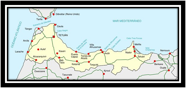 Mapa del Protectorado Español en Marruecos. La presencia española en el norte de África se extendió durante cuarenta y cuatro años, desde 1912 hasta 1956, cuando Marruecos obtuvo su independencia. El régimen administrativo del Protectorado mantenía una dualidad formal de autoridades: la administración marroquí, al frente de la cual se encontraba el jalifa que ejercía por delegación del sultán y la española, a cargo del correspondiente alto comisario. Con excepción de los años de la Segunda Guerra Mundial, Tánger se mantuvo siempre como una ciudad administrativamente independiente, con su propio estatuto al margen del Protectorado.