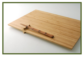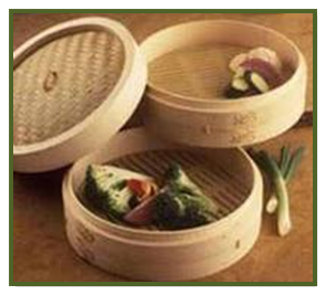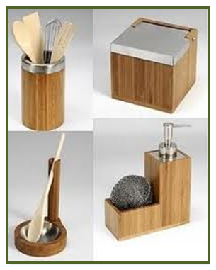 Accesorios para la cocina como bandejas con palitos (los típicos palitos para comer), cucharas, espátulas, especieros, platos, cuencos, cestillos para cocinar al vapor.