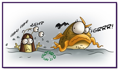 ¡Otra vez la que se armó! Milagritos subiendo y bajando del agua, la carpa Doña Bigotona que estaba de mal humor, detrás de ella pegando bocados a ver si podía tragársela porque estaba ya de Milagritos hasta el moño, los peces de colores, que nunca habían visto una Babosa, iban a por ella y la pellizcaban y la mordisqueaban creyendo que era un juguete y Tadeo intentando agarrarla por donde fuera para que su Milagritos no se ahogara.